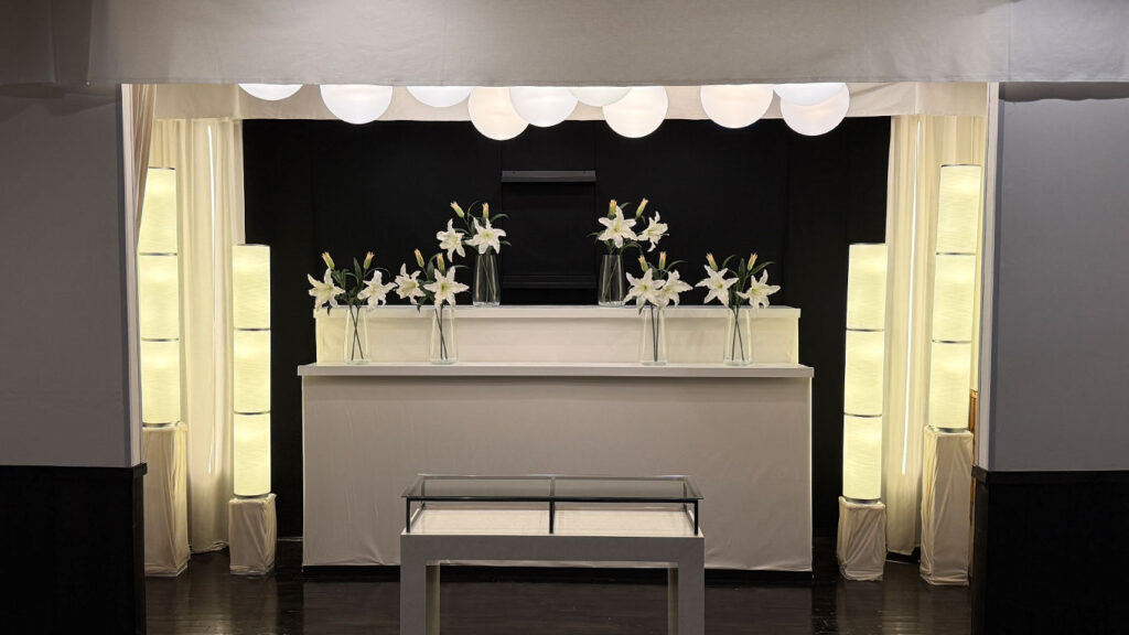 祭壇の白と濃い木目のコントラストが、心穏やかなお見送りを演出します。